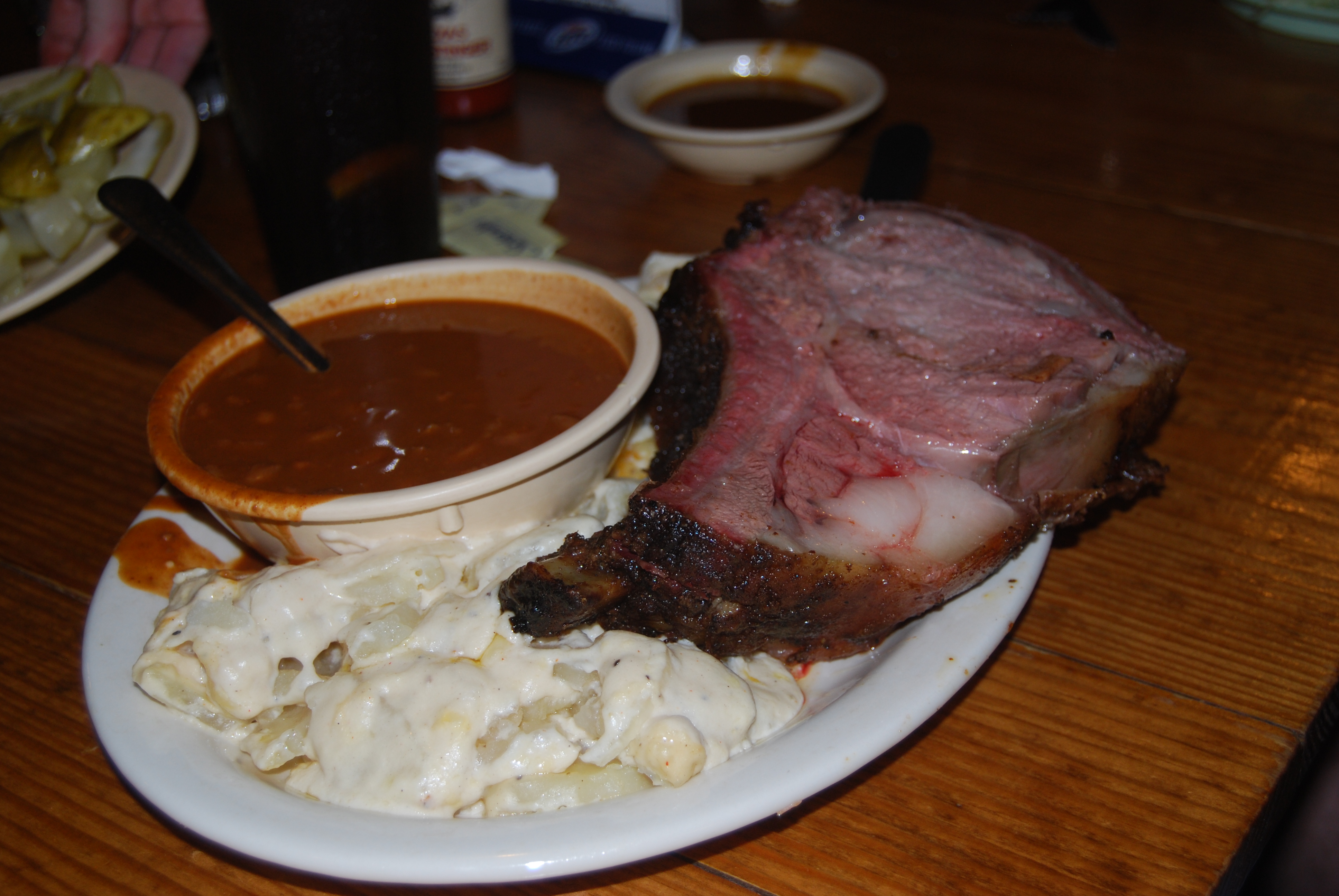 The first night we were in Texas, my cousin and aunt took us to The Salt Lick. I had bar-b-que prime rib (the Sunday special) that was so tasty! But it was so big (2 ½ lbs) that my sister and I had prime rib sandwiches the next day. The sides were okay – scalloped potatoes and baked beans – but the prime rib itself was delicious!