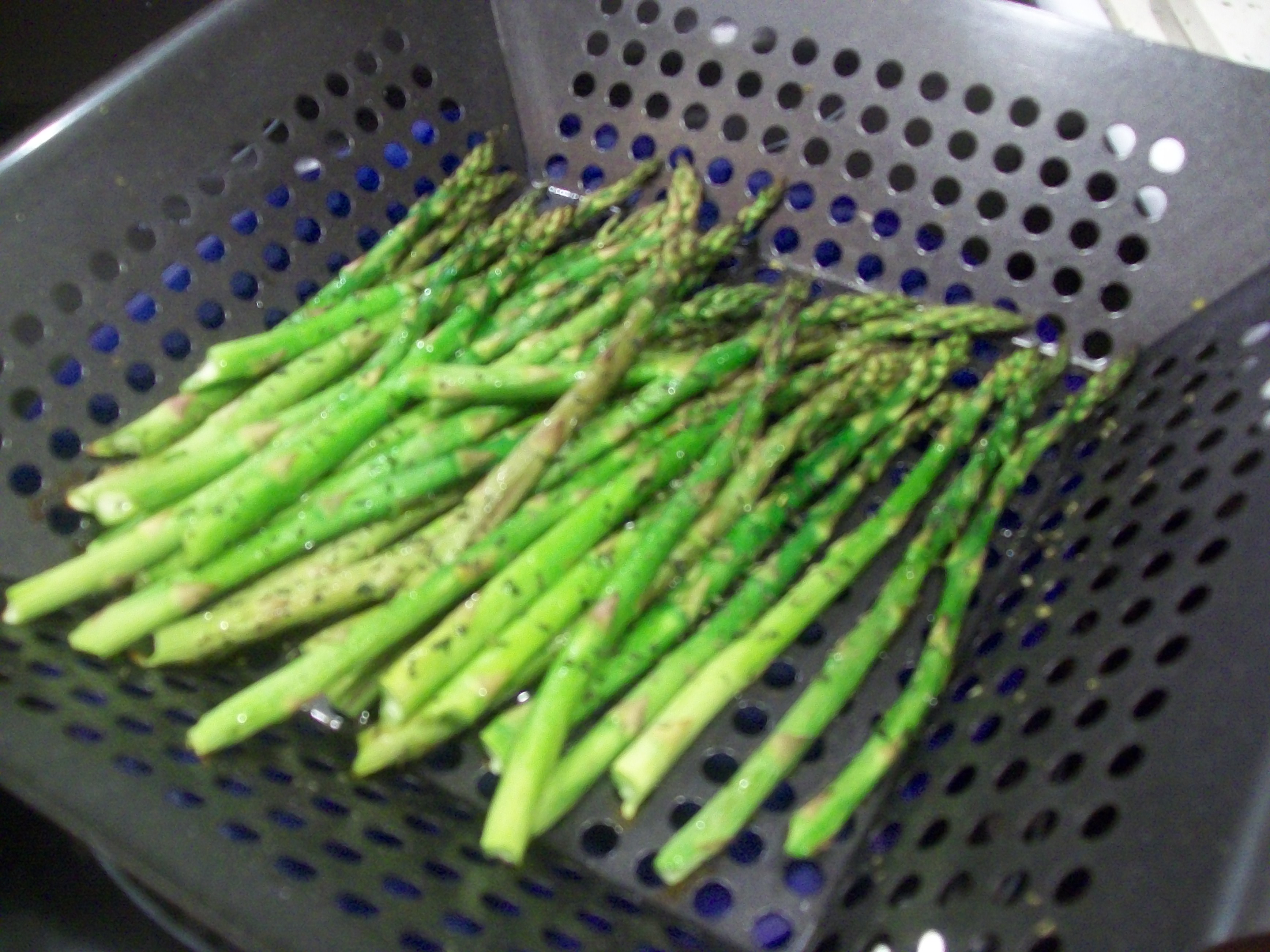 Rinse asparagus spears. Snap off the woody bottoms of the spears. Place spears in the grilling pan and rinse. Drizzle with olive oil and toss with fingers to distribute oil. Sprinkle with savory and toss again. (I do the rinsing and drizzling by balancing the grilling pan over my smaller sink by its handles, like you would a colander.)