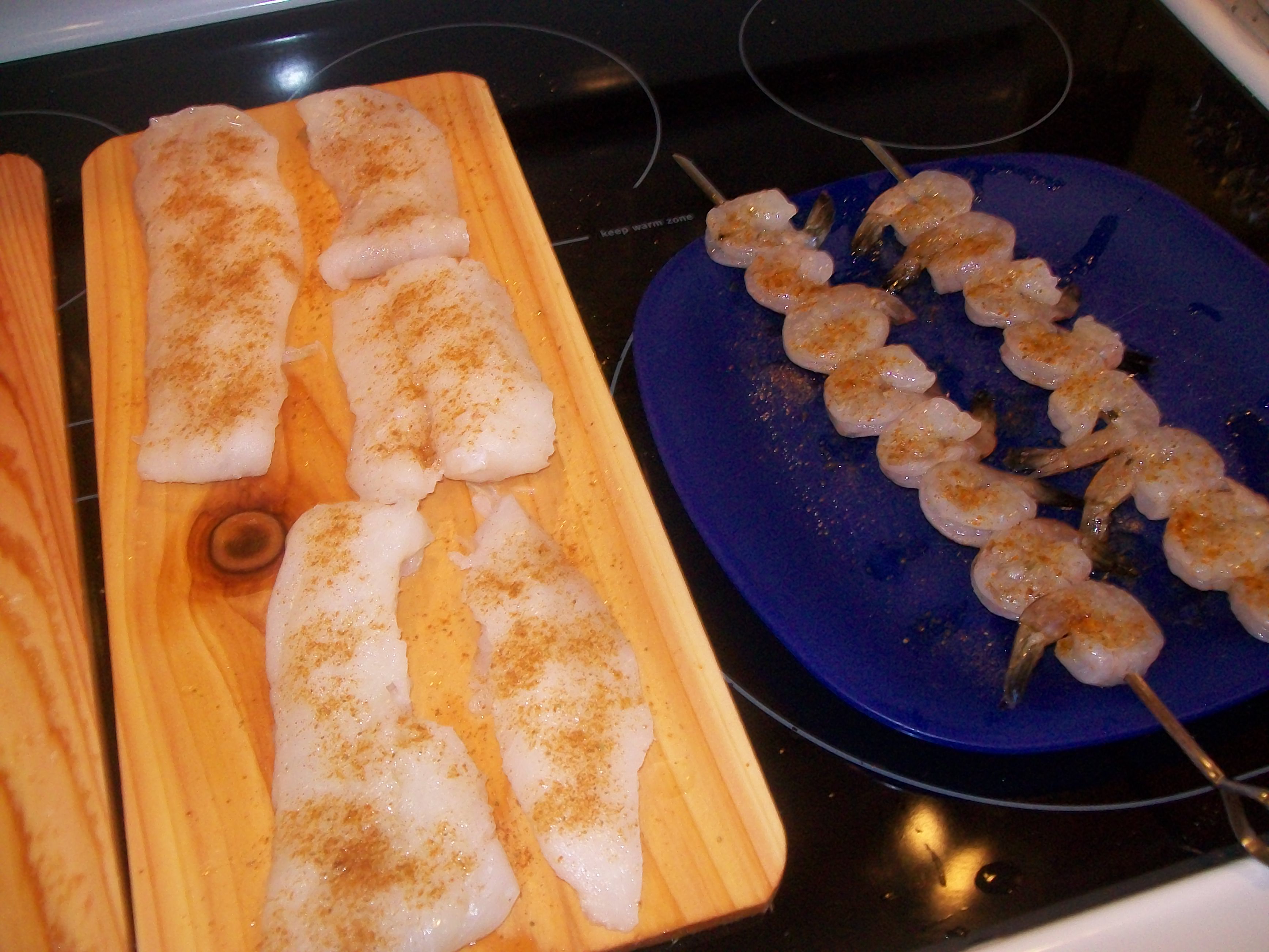 The weekend before last when I went grocery shopping the fish counter looked really good and fresh, so I decided to try out the cedar planks. As first I was just going to get some cod, but then I noticed that some of the shellfish was buy-one-get-one so I got some shrimp and scallops, too.