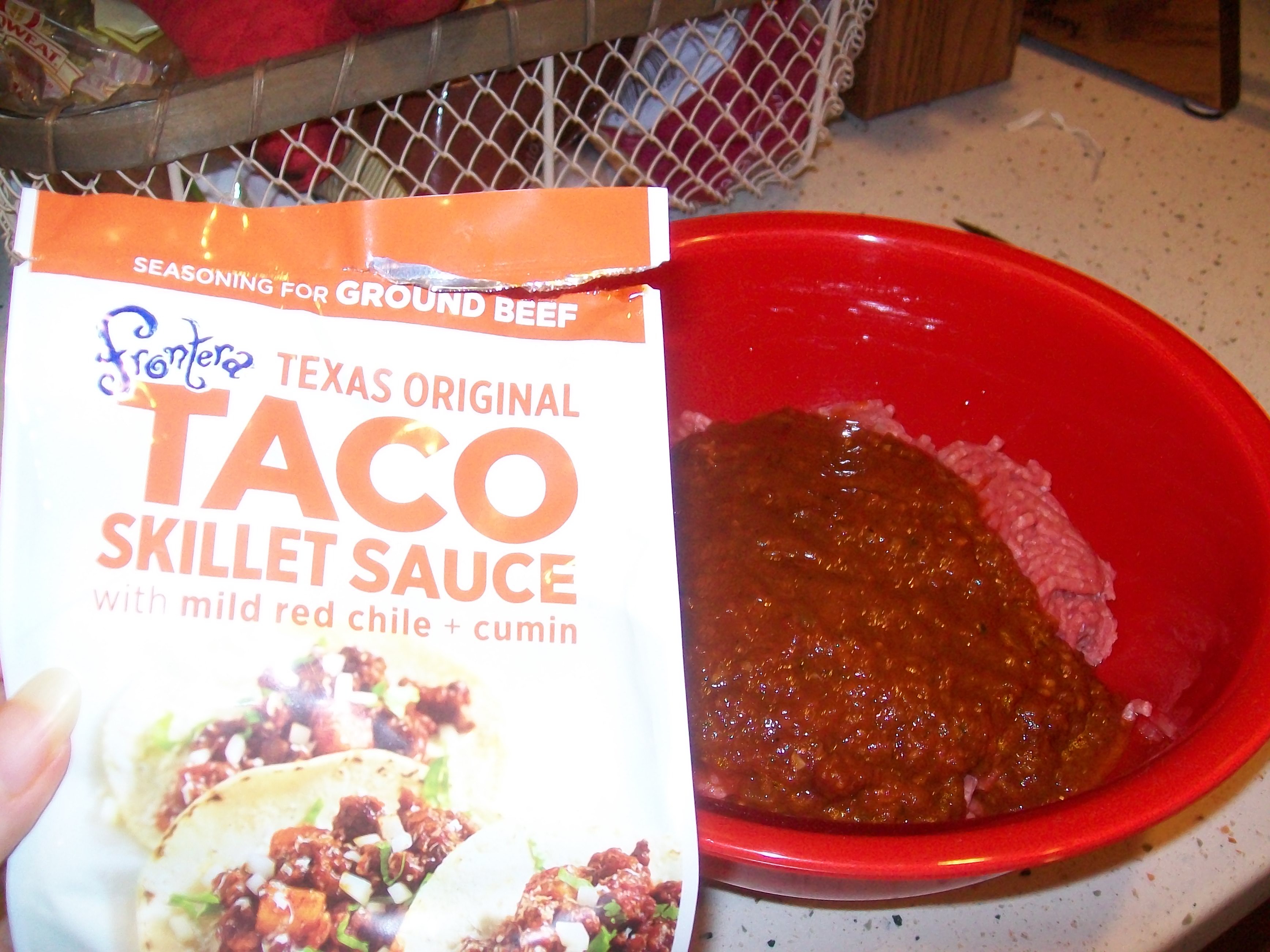 Mix together ground beef and Frontera Taco Skillet Sauce. Divide meat into desired number of patties (I made 5) and press into hamburger shape.
