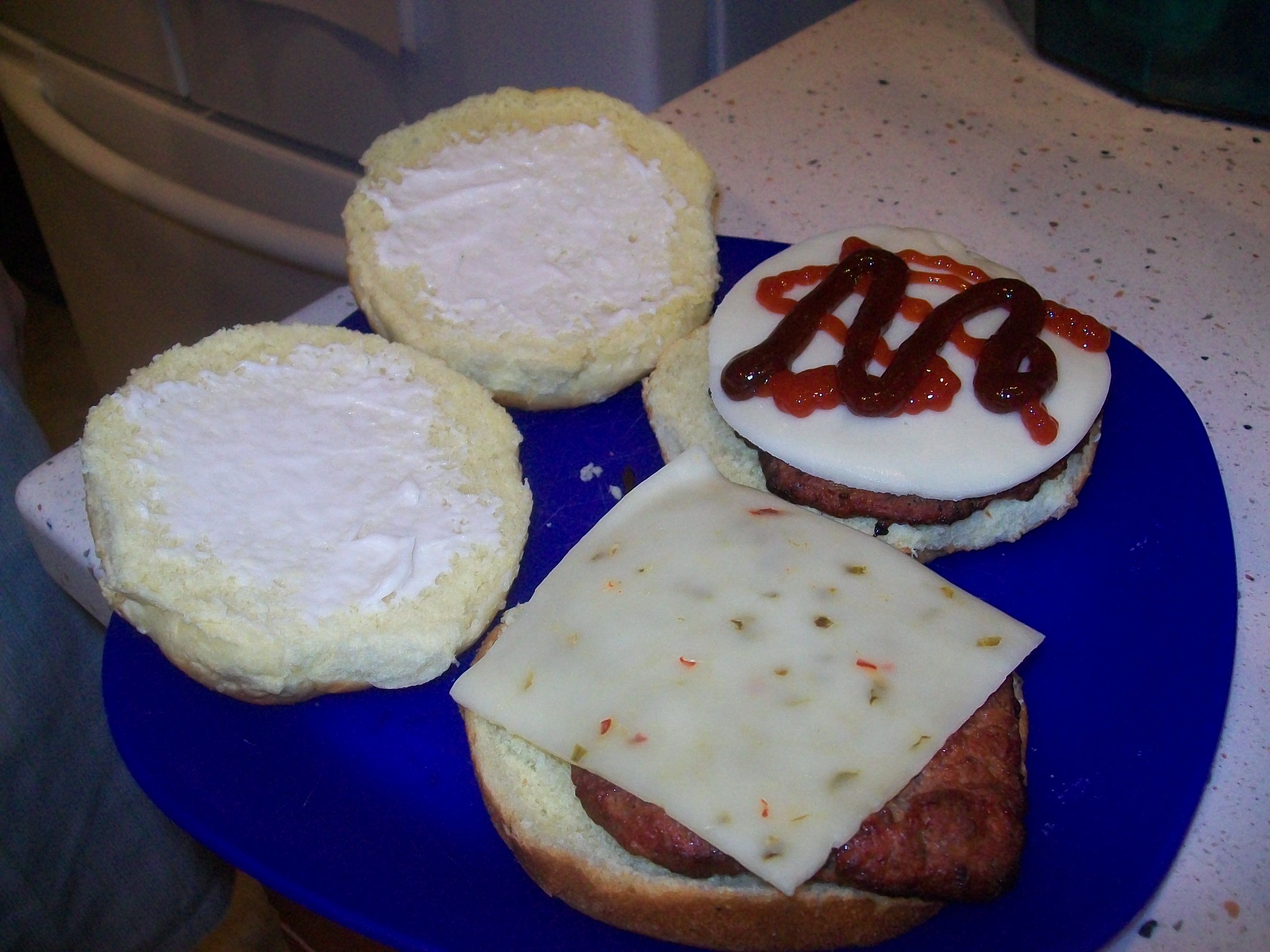 My son doesn’t like peppers, onions, and avocados, so he assembled his as closed sandwiches (yes, he had 2) with the burger, pepper jack cheese on one and provolone on the other, Miracle Whip, ketchup, and barbecue sauce.