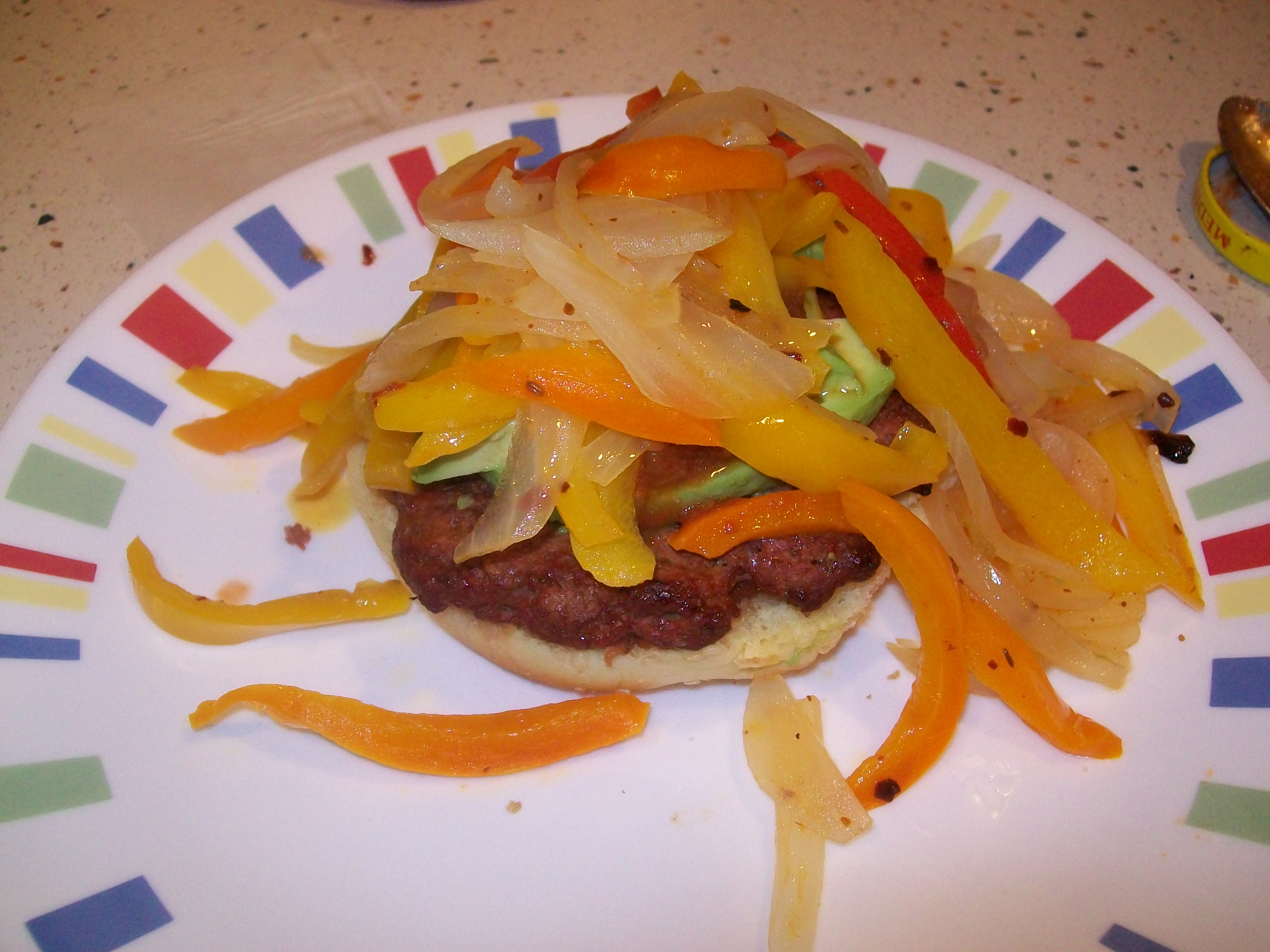 I assembled mine open-faced with the burger, avocado, cooked peppers and onions, and salsa — no cheese, of course, but it didn’t need it.